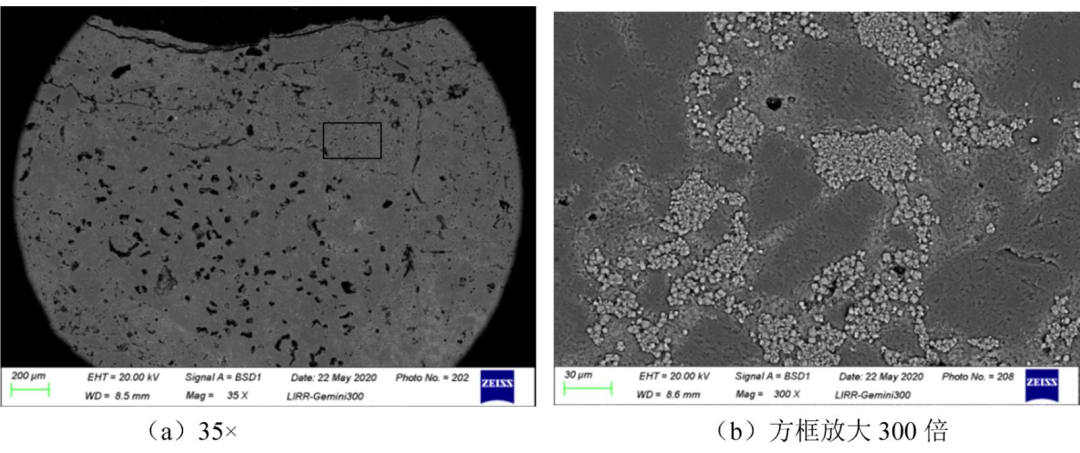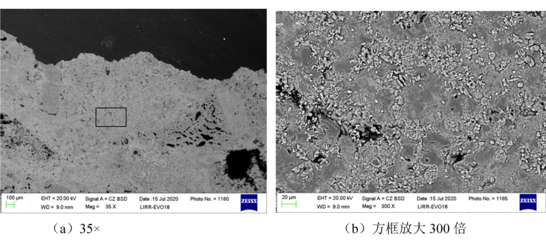 抗剝落高鋁磚JA堿侵蝕后坩堝底部0~10mm區域微觀結構照片見圖5。從圖5(a)觀察發現:坩堝底部表層結構變得致密,礬土顆粒被侵蝕現象明顯,基質中顆粒結構變得不明顯。從圖5(b)觀察看出:基質顆粒邊緣變得非常模糊,氣孔或晶界填充大量的淺顏色新相。抗剝落高鋁磚JA顯氣孔率高,碳酸鉀沿氣孔或晶界進入磚體侵蝕試樣內部,侵蝕深度大。對侵蝕層進行物相分析,發現侵蝕層有鉀霞石生成(見圖6)。大量鉀霞石的生成造成體積膨脹,導致抗剝落高鋁磚產生大的貫穿裂紋。
