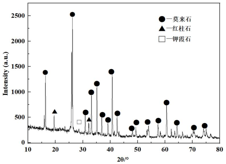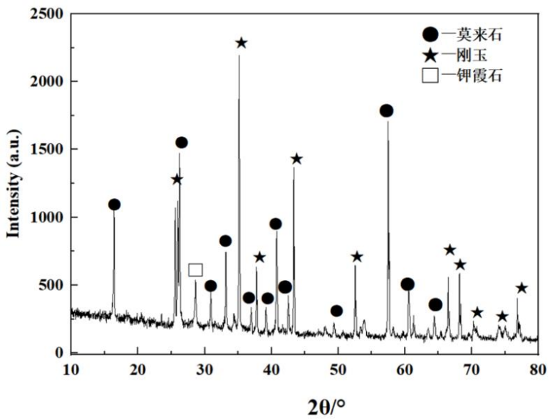 低鋁莫來石磚M55堿侵蝕后坩堝底部0~10mm區域微觀結構照片見圖7。從圖7(a)可以看出:低鋁莫來石磚M55坩堝底部表層結構也產生少量的裂紋,結構也變得致密,但與抗剝落高鋁磚差異較大。高倍下(見圖7(b))觀察,致密莫來石顆粒邊緣也產生較為明顯侵蝕,可見碳酸鉀對低鋁莫來石磚也形成一定侵蝕和滲透作用,但相對于抗剝落高鋁磚明顯改善。由衍射圖譜中(見圖8)可知:侵蝕層主要物相為莫來石和少量未發生轉化的紅柱石,同時也存在少量的鉀霞石。低鋁莫來石磚M55中采用的原料為莫來石均質料和紅柱石為原料,莫來石均質料結構致密,含有一定量的高硅非晶相,高溫下鉀融入非晶相形成高黏度玻璃相;同時,紅柱石分解形成的非晶態SiO2吸收部分碳酸鉀也生成高黏度玻璃相,并由其封閉耐火磚侵蝕層,阻礙K元素的滲透。少量的碳酸鉀與莫來石反應生成鉀霞石,鉀霞石的生成量低,產生的膨脹不足以破壞磚體結構,因此,低鋁莫來石磚M55表現出良好的抗堿侵蝕性能。